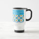 Eine hübsche, mit einem mix'n'match Muster der weißen Gänseblümchen auf einem Himmel-Blauhintergrund zu personifizieren Nichtfleck- Reise-Tasse, teamed mit weißen Polka-Punkten auf Himmel-Blau. Teil der vornehmen u. Painterly "Verkettungs" Sammlung.