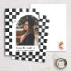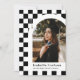 Diese moderne und einzigartige Ankündigung des Abschlusses zeigt einen schwarz-weiß karierten Hintergrund, der ein gerahmtes Foto des Absolventen in einem weißen Bogen mit dem Namen und der Schule des Absolventen unterstreicht. Eine kleine Gradationskappe wird im überprüften Hintergrund des Abschlusses des Absolventen geschickt angezeigt. Der Rücken hat einen lustigen, passenden, kontrollierten Muster im gleichen Weiß und Schwarz.