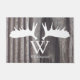 Verwitterter alter grauer Holzhintergrund mit weißer Elchantler-Silhouette und Ihrem personalisierten Familiennamen und Monogramm in Weiß.