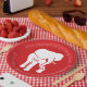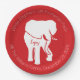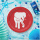Weißer Elefant auf rotem Hintergrund mit kundenspezifischem Kreistext: Weißer Elefant-Geschenk-Austausch-Party @ die Williams-Familie, am 23. Dezember 2025 und kundenspezifischer Mittetext: Genießen Sie. Sie können allen Text, einzigartige weißer Elefant-Weihnachten oder Ihren Party-Papier-Teller ändern oder löschen