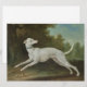 Dieses Design zeigt ein Gemälde des französischen Künstlers Jean-Baptiste Oudry (1686-1755). Es zeigt einen lila, weißen Windhund, der durch eine ländliche Landschaft sprang. Der Körper des Hundes ist schlank, aber muskulös und stark. Der Windhund trägt einen blauen Kragen um den Hals. Sein Schwanz ist beim Laufen und Sprüngen in der Luft aufgerollt. Der Kopf des Hundes ist umgedreht und sieht nach hinten, als würde er gejagt. Im Hintergrund stehen viele Bäume mit grünen Blätter.