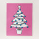 Eine Illustration eines eleganten, weißen Weihnachtsbaumes mit vielen blauen Hängelällen im rosa Hintergrund. Dieses Design ist für Menschen, die Weihnachten Lieben, geben Geschenke und Geschenke.