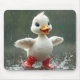 Ein fröhliches, weißes Entenchen mit roten Regenstiefeln spritzt fröhlich in einer Regenpudel
