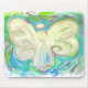 Malerei eines Engels im Weiß mit weichem Wirbel der Farbe. Der Engel schwimmt über einen ruhigen Hintergrund des Seeschaumgrüns und weich -BLAUS.