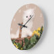 Weiße persische Kätzchen in einem Korbkorb mit Blume, die ihre Weltkatzenliebhaber um die Wanduhr umkreisen. Hintergrund ist beige, Zahlen können entfernt werden