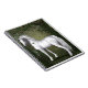 Ein magisches weißes Pferd steht in einem bezaubernden Wald, umgeben von farbenfrohen Kolibris in diesem digitalen Fantasy-Kunstwerk des Künstlers Jayne Wilson.