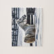 Ein schönes, weißes Pferd, das in seiner verschneiten Weide stehend ist.