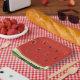 Grillabende im Sommer, Picknick im Park, die Ozeanwellen auf einem warmen Sandstrand - und eine reife, saftige Scheibe Wassermelone. Dieses in einem Melon-Design mit einer hellen roten Wassermelone in gewaschener Wasserfarbe. Nimm eine Scheibe und genieße den Spaß!