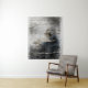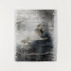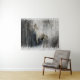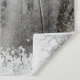 Weißes Pferd auf rustikaler Holzstruktur im schneebedeckten Winterwald.
