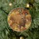 Dieses Ornament besticht durch eine zarte, braune Weide mit weißem Hirsch, die durch das Gras eines offenen Feldes weidet. Sie hat angehalten und sich den Kopf gedreht, weil sie ein Geräusch gehört hat. Ihre großen Ohren sind aufmerksam. Das Gesicht hat weiße Markierungen um Augen und Nase. Sie ist umgeben von Herbstfarben Rot, Gelb, Grün, Orange und Gold.