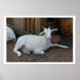 Foto einer weißen Ziege, die gegen Gebäude ruht.