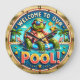 Diese runde Wanduhr besticht durch eine lustige Cartoon-Schildkröte mit einer Sonnenbrille und einem hawaiianischen Shirt, die auf einem Innenrohr in einem blauen Schwimmbecken schweben. Die Schildkröte bietet ein erfrischendes Getränk, umgeben von Palmen und Liegestühlen. Die Worte "WILLKOMMEN ZU UNSEREM POOL!" werden prominent angezeigt und machen es zu einem fröhlichen und einladenden Stück, das alles Set in einem goldenen, gerippten Rahmen.