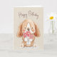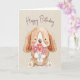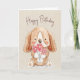 Watercolor Welpenhund mit rosa Blume auf weichem Einbruch texturierter Hintergrund mit Happy Birthday Text. Text ist bearbeitbar.