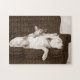 Diese beiden liebenden Mischhunde waren die besten Freunde. Charlie, der große weiße Junge wurde alt und brauchte einen Freund, um ihm ein neues Leben zu ermöglichen. Wir entdeckten, dass der braune GSD/Labrador-Kreuzhund in einem winzigen Käfig in einem Tierladen behalten wurde. Der Assistent sagte uns, dass er nachts in den Schrank im Laden gelegt wurde, er war in einem traurigen Staat und sah seelenlos aus, wir mussten ihm nur helfen. Also gingen wir Zuhause und sammelten unseren lieben Charlie, unseren weißen gemischten Zuchtjungen, wir nahmen Charlie, um den traurigen kleinen Hund im Käfig zu treffen, Charlie zeigte keine Intoleranz gegenüber dem 16-wöchigen Jungen, wir waren so erleichtert zu wissen, dass Charlie die Rettung seines neuen Kumpels "genehmigt" hatte. Wir nannten den Welpen Tod, weil er ein wenig Foxy aussah (Tod ist ein anderer Name für einen Fuchs in Schottland und Nordengland) und innerhalb weniger Tage hörte Tod auf, Angst vor Gras, Blume und Schmetterlingen zu haben, und er kam aus sich selbst, Charlie hatte seinen Freund gefunden. Die beiden wurden für die kurze Zeit untrennbar, die Charlie’s Leben übrig blieb. Charlie starb etwa 9 Monate später im Alter von neuneinhalb Jahren, Tod war bereft und nach einiger Zeit wurde er schwer epileptisch, und genau wie Charlie brauchte er einen Freund, um seine Geister zu heben, also kam Eddie! und das ist eine andere Geschichte! Ich habe die Originalfarbe und das entspannende Hundegemälde digital auf Sepia verbessert und es sieht gut aus auf diesem hochwertigen Puzzle. Ich bin sicher, dass es ein ganz besonderes Geschenk für jemanden machen wird, der Tierkunst mag, besonders Hundebilder, oder vielleicht ist es eine kleine Leckerei für sich selbst. Das Originalgemälde ist in sanften Pastellfarben gehalten und trägt den Titel "Ich und mein Pal"