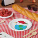 Ein Globus mit einem Weihnachtsmut darauf. Dieses Design wirkt auf diesen Paper-Tellern sehr effektiv