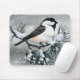 Linda Baysinger Aquarellmalerei Pecks eines Schwarzen bedeckte Chickadevogel, Sitzen auf einer Kiefernniederlassung, im Schnee mit einer Kappe. Bild © Linda Baysinger Peck alle Rechte vorbehalten