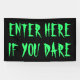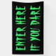 Machen Sie den Eingang zu Ihrem Spuk Haus aussehen und leicht für alle mit dieser Enter Wenn Sie wagen Spuk Haus Outdoor Banner-Signatur. Der Hintergrund ist fett schwarz und Sie können jede Farbe anpassen, die Sie wünschen. Der Text auf dem Banner ist "Enter here if you wagt" in hellen Neonkalk grün bedrückte spöttische Schrift. Dies kann auch in verschiedenen Farben geändert werden
