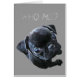 Ein Foto unseres schwarzen Mops, Maya, als sie ein Welpe war. Das Bild wurde mit Fotoshop-Filtern für einen kreativen Look verändert. Maya schaut mit großen Augen auf, als würde er sagen: "Wer bin ich?"