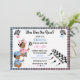 Humorvolle Gender-Einladung in einem Rennthema mit Mädchen & Jungen, die Rennfahnen halten, die auf ihrem Geschlecht für die Ziellinie jubeln! Rosa, blau, schwarz und weiß kariert.
