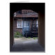 ein Bild einer Tür mit Krabbenpfannen davor, durch eine Gasse hindurch