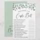 Brautparty "Wer kennt das Paar am besten" Spielblatt mit eleganten saftig grünen Eukalyptusfarben und einem stilvollen Skript. Personalisieren Sie die Fragen und fügen Sie den Namen und das Duschdatum der Braut auf der Rückseite hinzu.