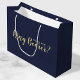 "Werden Sie Träger sein?" Moderne Geschenktasche mit dem Titel "Will You Be My Ring Bearer?" im modernen, goldfarbenen Script-Schriftart-Stil auf marineblau Hintergrund. Bitte beachten Sie: Die Details der Folie werden im Kunstwerk simuliert. Bei der Herstellung dieses Produktes wird keine Folie verwendet.