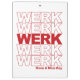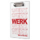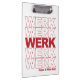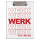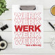 Bleibe motiviert....WERK! Unsere lustige und trendige Pop-Kultur inspiriert Clipboard aktualisiert das klassische "Danke, habt einen schönen Tag" Design mit "WERK" wiederholt sich fünf Mal in fett roter Blocktypografie und "habe einen schönen Tag" unten geschrieben.
