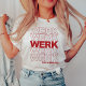 Die trendige und lustige Parodie des Klassikers "Danke, habe einen schönen Tag"-Einkaufstüte zeigt ein niedliches Retro-Typografie-Design mit "WERK" in fett roter Schrift wiederholt sich fünf Mal, und "haben einen schönen Tag" darunter.