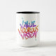 Diese lebendige Tasse enthält den Satz "Value Vigurous Vision" in einem fett anmutenden Graffiti-Schriftart. Der Text ist Set vor einem geometrischen Hintergrund mit einem dynamischen Farbverlauf, der ein dynamisches und auffälliges Design schafft. Die Ästhetik ist modern, energisch und inspirierend und eignet sich somit hervorragend für Menschen, die mutige, ausdrucksstarke Kunstwerke schätzen.