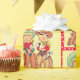 Cowboy- und Cowgirlkindergeschenk-Packpapier. Der Hintergrund ist gelber Karo mit einer roten und weißen Sterngrenze.