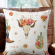 Dieses charmante Boho-Design besticht durch ein Western-Cowboy-Thema mit leuchtenden und lebhaften rosa Blumen und Orangen, Kakteen, Cowboy-Hüten und Stiefeln. Fügen Sie Ihrem Zuhause mit diesem Kopfkissen einen Western-Stil hinzu oder geben Sie ihm für jeden Anlass ein Geschenk.