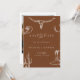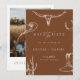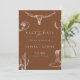 Feiern Sie Ihre Liebe mit dieser rustikalen westlichen Cowboy-Hochzeitseinladungskarte "Save the Date". Dieses Design enthält handgezeichnete westliche Illustrationen, darunter einen Longhorn-Schädel, Kaktus, Cowboystiefel, Hufeisen und Hut auf einem warmen Terrakotta-Hintergrund. Perfekt für Paare, die eine ländliche, Ranch- oder westlich inspirierte Hochzeit planen.
