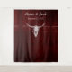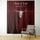 Rustikaler Western burgundy Bull Kuh Schädel Western Cowboy Rodeo Hochzeitsfotografie Hintergrund. Die Einrichtung ist im Landhausstil gehalten. Vintager antiker, wilder Westen inspiriert für die Neuvermählten. Cooles Bauerndesign. Personalisieren Sie Ihren Text für Ihren besonderen Tag. Bildrecht Marg Seregelyi Fotografie.