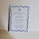 Whimsical handschriftlich Französisch Blau, Hochzeit Einladung. Vorlagenfeatures, handgezeichneter Rahmen mit gewellten Linien und Hochzeitsringe doodle, hellrosa Streifen Hintergründe. Schriftart- und Elementfarben können durch Klicken auf die Option "Bearbeiten mit dem Designwerkzeug" angepasst werden.