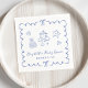 Niedliche Servietten für Ihre Babydusche mit einem französisch-blauen gewellten Rahmen mit Bögen, skurrilen, handgezeichnet Herzenzeichnungen, Sternen, Kuchen- und Kinderzimmer-Dekor und dem Namen der künftigen Mutter, die in einem spielerischen blauen Drehbuch gezeigt wird.