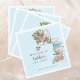 Whimsical Brautparty Tee Party Servietten sind in Aquarellbildern von gestapelten Blumenteapot und Teetassen auf hellblauem Hintergrund dargestellt. Es sind passende Teller verfügbar.