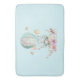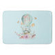 Eine Badematte mit einer charmanten Illustration eines kleinen sonnigen Reitens in einem Heißluftballon, der mit einem extravaganten rosa Band geschmückt ist, sowie einige Blume und Schmetterlinge. Der pastellblaue Hintergrund verleiht ihm ein Vintages Traumgefühl.