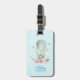 Ein personalisierter Gepäckanhänger mit einer charmanten Illustration eines kleinen sonnigen Reitens in einem Heißluftballon, der mit einem extravaganten rosa Band geschmückt ist, sowie ein paar Blume und Schmetterlinge. Der pastellblaue Aquarellhintergrund verleiht ihm ein Vintages, traumhaftes Ambiente.