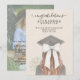 This Whimsical Calligraphy Graduation Bow Photo Announcement features a beautiful, hand-painted watercolor sketch of a graduate from a back-view perspective. The design highlights a stylish black mortarboard adorned with a delicate border of white pearls and a stunning, oversized fabric bow with long, flowing tails. To complete the look, the graduate holds a lush bouquet of creamy white roses.