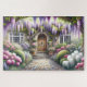 This enchanting scene captures the essence of a storybook cottage garden, bursting with lush blooms and cascading wisteria in soft purples, pinks, and whites. A charming arched wooden door welcomes you through a stone path framed by flowering shrubs, manicured greenery, and dreamy light filtering through the foliage. The overall mood is peaceful, romantic, and full of secret garden nostalgia—perfectly aligned with cottagecore and fairytale aesthetics. The composition draws you inward, evoking a sense of wonder and serenity beneath the floral canopy. AI generated artwork.