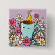 Blaue Tasse warmen Kaffees sitzend in einer Reihe von niedlichen Cartoon rosa und gelb Blumen.