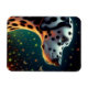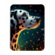 "Whimsicaler Dalmatinenhund" Ein wunderschön illustrierter Dalmatiner blickt gedanklich in einen magischen Nachthimmel voller glühender Glühwürmchen. Das weiße Fell des Hundes ist mit klassischen schwarzen Flecken geschmückt, und sein Ausdruck ist ruhig und neugierig, als ob es vom sanften Flicker der Lichter um ihn herum gefangen wäre. Der Hintergrund strahlt mit winzigen goldenen und grünen Flecken aus und schafft eine traumhafte Atmosphäre. Das weiche Glühen hebt die Merkmale des Dalmatiners mit Wärme und Eleganz hervor.
