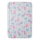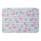 Eine Badematte mit einem Muster und einer lustigen Sommerkulisse. Rosa Flamingos und Ananas Set auf einem hellblau gestreiften Muster mit Blätter und Herzen herum.