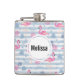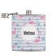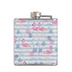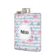 Eine Flasche mit einem Muster mit einem lustigen sommerlichen Flair. Rosa Flamingos und Ananas Set auf einem hellblau gestreiften Muster mit Blätter und Herzen herum.