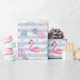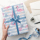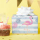 Papier mit einem Muster mit einem lustigen sommerlichen Ambiente umhüllen. Rosa Flamingos und Ananas Set auf einem hellblau gestreiften Muster mit Blätter und Herzen herum.