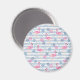 Ein Magnet mit einem Muster mit einem lustigen sommerlichen Flair. Rosa Flamingos und Ananas Set auf einem hellblau gestreiften Muster mit Blätter und Herzen herum.