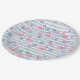 Papier Teller mit einem Muster mit einer lustigen sommerlichen Atmosphäre. Rosa Flamingos und Ananas Set auf einem hellblau gestreiften Muster mit Blätter und Herzen herum.