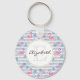 Eine Schlüsselkette mit einem Muster mit einer lustigen sommerlichen Atmosphäre. Rosa Flamingos und Ananas Set auf einem hellblau gestreiften Muster mit Blätter und Herzen herum.