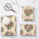 Wrapping paper sheets with a cute image. Blue. pink and cream colored flowers with green leaves. Set inside a green flower pot with a green plaid cloth hanging over the side.
