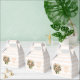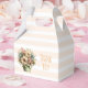 A tiny favor box with a cute image. Blue. pink and cream colored flowers with green leaves. Set inside a green flower pot with a green plaid cloth hanging over the side.